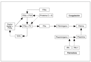 Figura 1. Mecanismos de la coagulación y la fibrinólisis. La flecha discontinua significa inhibición y la continua equivale a estimulación.