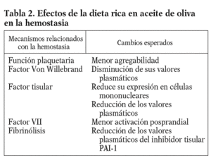 Otro mecanismo clave e importante de la hemostasia es la fibrinólisis, crucial para la reabsorción del trombo. Su actividad depende de la acción del activador tisular del plasminógeno (tPA), gracias al cual se genera la plasmina, enzima que hidroliza la fibrina recién formada y evita su crecimiento. Su mecanismo regulador más importante depende de los valores plasmáticos del inhibidor del activador tisular del plasminógeno tipo 1 (PAI-1), los cuales se incrementan con dietas ricas en ácido palmítico72. Sin embargo, una DM, rica en aceite de oliva, redujo sus concentraciones, en comparación con otra pobre en grasa73. Existen, sin embargo, datos discrepantes, como un estudio posterior, que utilizó aceite refinado de semillas, mientras que nuevamente el aceite de oliva virgen, en pacientes hipertensos, redujo los valores plasmáticos de PAI-1, en comparación con el aceite de soja74. Nuevos trabajos, con dietas ricas en aceite de oliva, confirmaban de nuevo su efecto beneficioso, lo que lleva a pensar que podría existir una acción específica, de sus micronutrientes, en la fibrinólisis75,76. Menos definitivos son aun los datos sobre el fibrinógeno, tal vez porque al ser un marcador inflamatorio sus concentraciones podrían depender principalmente de la inflamación subyacente. En un estudio en el que los participantes consumieron una dieta rica en MONO, procedente de aceites refinados, se incrementaron sus valores67 mientras que la DM los redujo, al mismo tiempo que otros parámetros inflamatorios77. Serán necesarios más estudios para definir estos efectos78.
