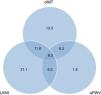 The overlap in the incidence of subclinical CVD and atherosclerosis across 3 different territories (cIMT, LVMI and aPWV) is displayed in the Venn diagram (Fig. 2). Of 120 subjects, 43 (36%) had no evidence of atherosclerosis, 43 (36%) had 1 territory with atherosclerotic involvement, 27 (22%) had 2 territories with atherosclerotic involvement and 7 (6%) had all 3 territories involved.