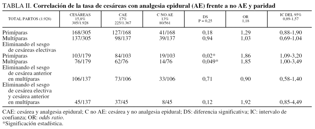 El 15,8% (305) finalizó en cesárea: 225 con AE (17%), 127 primigestas (43 electivas) y 98 multíparas (36 electivas y 25 con cesárea anterior). Sin AE 80 (13%), primigestas 41 (22 electivas) y multíparas 39 (25 electivas y 6 cesárea anterior) (tabla II). En términos globales no hay diferencias significativas en el índice de cesáreas según se haya conducido el parto con AE frente a sin AE (p = 0,25; OR = 1,18; IC del 95%, 0,89-1,57). Al introducir el factor paridad, tampoco se observa significación estadística: primíparas, 168 cesáreas (127 con AE frente a 41 sin AE; p = 0,18; OR = 1,29; IC del 95%, 0,88-1,90) y multíparas 137 cesáreas (98 con AE frente a 39 sin AE; p = 0,94; OR = 1,03; IC del 95%, 0,69-1,04); sin embargo, «si se eliminan las cesáreas electivas en ambos grupos» sí hay DS (p = 0,02; OR = 1,86 (IC del 95%, 1,09-3,2) en primíparas (103; 84 con AE frente a 19 sin AE) y (p = 0,04; OR: 1,85; IC del 95%, 1-3,49) en multíparas (76; 62 con AE frente a 14 sin AE). En cuanto a la forma de comienzo del parto se obtienen los siguientes resultados: p = 1, OR = 0,95 (IC del 95%, 0,4-2,2) para el total de partos inducidos; si se atiende a la paridad no hay DS en primíparas (p = 0,5; OR = 0,61; IC del 95%, 0,2-1,9), ni en multíparas (p = 0,82; OR = 1,33; IC del 95%, 0,39-4,94). Cuando el parto fue de comienzo espontáneo en términos generales, no se encuentran DS (p = 0,2; OR = 1,32 (IC del 95%, 0,86-2,08); atendiendo a la paridad no hay DS para primíparas (p = 0,77; OR = 0,85; IC del 95%, 0,41-1,76), en multíparas aunque no hay DS sí la roza (p = 0,057; OR = 1,75; IC del 95%, 0,98-3,16).
