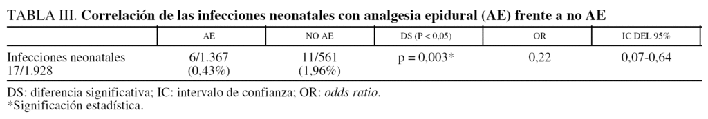 En cuanto a la tasa de infecciones neonatales, se detectaron 17 casos (tabla III): onfalitis (1), conjuntivitis-dacriocistitis (4) y otras infecciones (12). Seis casos se correlacionaron con aplicación de AE (35,3%) y 11 sin ella (64,7%), y se halló DS en cuanto a la disminución de infecciones neonatales y parto con AE (p = 0,003; OR = 0,22; IC del 95%, 0,07-0,64).