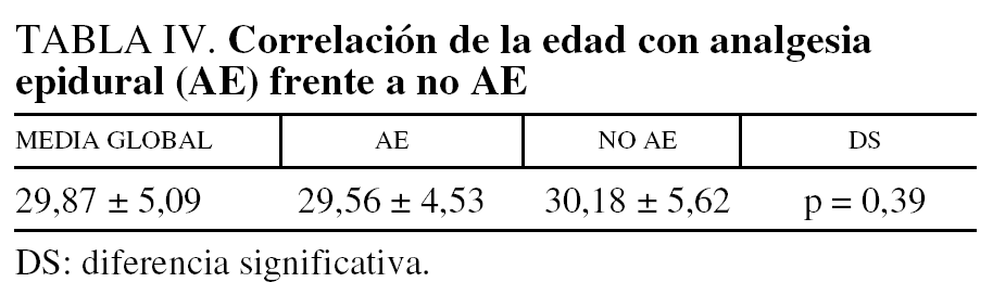 La paridad sí halló DS, siendo mayor la proporción de primíparas con AE en relación con las multíparas (tabla V). Este dato es lógico al tener en cuenta que la evolución del parto es más rápido en la multigesta, es mayor el número que acude de urgencias con dilatación avanzada y el umbral doloroso es más bajo.