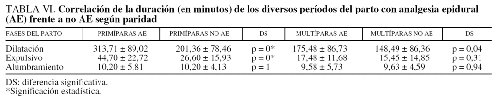 Las diversas fases del parto se ven afectadas por este tipo de analgesia, y según algunos autores éstas se prolongan1-4, por el contrario otros no hallaron diferencias significativas5,6. En el presente estudio, el tiempo de dilatación fue más largo al administrar AE con DS, independientemente de la paridad (tabla VI). El expulsivo sí se afecta por la paridad, y aunque se prolonga bajo AE, tanto en primíparas como multíparas, sólo se encontró DS para el grupo de primíparas (tabla VI). Acerca de la tercera fase del parto o alumbramiento, no se encontró DS en cuanto a la prolongación de este período según se emplee AE frente a no AE (tabla VI), así lo corroboran autores como Rosaeg et al7.