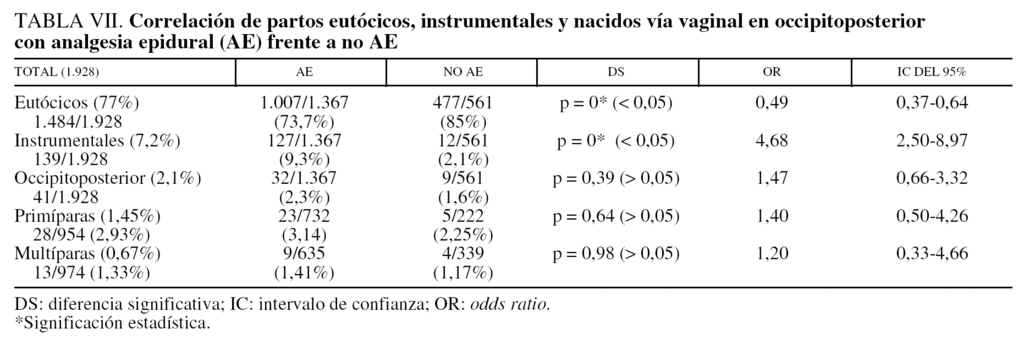 En cuanto al índice de instrumentación, según Lieberman et al4 se ve incrementado de forma significativa, no para otros autores5,8,9. En nuestra serie sí observamos un incremento de parto instrumental con AE frente a sin AE (el 9,3 frente al 2,1%) y clara DS (tabla VII).
