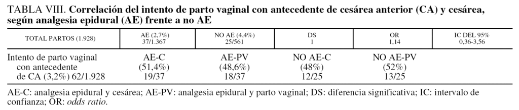 De los 62 embarazos con cesárea anterior, 31 (de éstos 5 fueron inducidos, 2 de ellos con AE y 3 sin AE, por 26 espontáneos, de los que 16 recibieron AE y 10 no) finalizaron vía vaginal frente a 31 por cesárea (6 inducidos, de los que 3 con AE y 3 sin AE, por 25 espontáneos, de los cuales 16 recibieron AE y 9 sin AE) (p = 1; OR = 1,14; IC del 95%, 0,36-3,56).