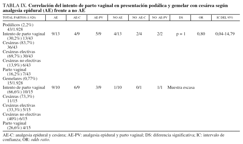 Cuando se analiza el antecedente de cesárea previa no se observa DS en la incidencia de parto abdominal al aplicar AE o no (tabla VIII). No se consideró una contraindicación el uso de AE con el antecedente de cicatriz segmentaria uterina anterior siempre que la vigilancia mediante monitorización maternofetal sea continua, y no se detectó ninguna complicación en los 37 partos con cesárea anterior conducidos con AE. De igual manera, no se contraindicó la AE en presentaciones podálicas y gemelares, que obtuvo buenos resultados, y pensamos que este tipo de analgesia no incide en el devenir del parto, aunque bien es verdad que, en nuestro estudio, la representación de la muestra es muy escasa (tabla IX).