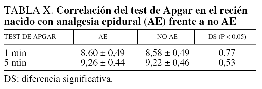 Otra razón por la que a veces se cuestiona la analgesia epidural es la repercusión sobre la morbimortalidad neonatal; se argumenta, sobre todo por pediatras-neonatólogos, que el aumento de duración del trabajo de parto y expulsivo, así como un mayor tiempo de bolsa rota y un mayor número de tactos, hacen que la infección neonatal se vea con más frecuencia. Leighton y Halpern8 y Bodner-Adler et al12, no observan efectos adversos neonatales significativos cuando se emplea AE en el parto, por el contrario Lieberman et al13 y Goetzl et al14 sí advierten mayor morbilidad. Nosotros no hallamos esta incidencia, sino todo lo contrario, observamos DS en la reducción de infecciones neonatales al administrar AE, con la prudencia obligada al manejar una muestra reducida (tabla II). El test de Apgar mejora en recién nacidos cuyas madres se sometieron a epidural, aunque sin DS (tabla X).