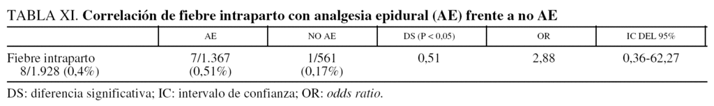 A pesar que el porcentaje de fiebre intraparto fue superior en los partos bajo AE frente a aquellos sin AE, no se obtuvo DS en nuestra casuística (tabla XI).