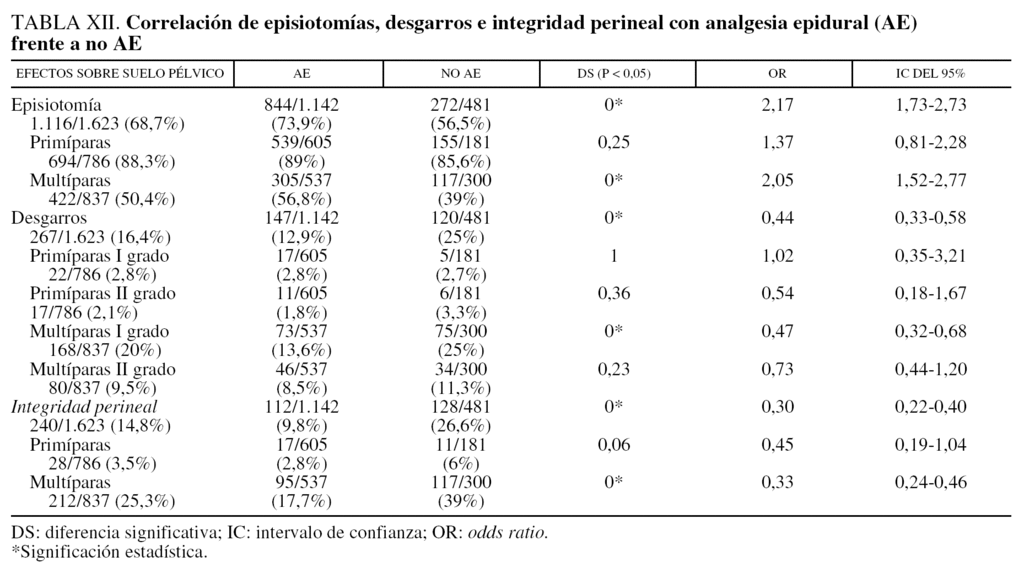 Los resultados en cuanto a episiotomías, desgarros o integridad del periné tras evaluar una muestra de 1.623 casos (eliminando las 305 cesáreas) fueron los siguientes: se encontró DS entre las episiotomías realizadas cuando se empleó la AE frente a no AE (p = 0; OR = 2,17; IC del 95%, 1,73-2,73); ahora bien, si la comparación se efectúa según paridad en el grupo de primíparas no se halla DS (p = 0,25; OR = 1,37; IC del 95%, 0,81-2,28), por el contrario en las multíparas si hubo DS (p = 0; OR = 2,05; IC del 95%, 1,52-2,77).