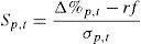 With the data determined with (5) we also calculated a daily standard deviation with the t−30 days of returns and performed a visual comparison of the returns and daily standard deviation between benchmarks. With the returns and standard deviation data, we also calculated the observed (daily base; not a yearly one) Sharpe (1966) ratio (Sp,t) by using, as risk free asset (rf), the daily 28 days CETES rate in secondary market published by Banco de México (2013). This was done by using the next expression: