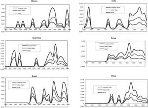 Figures 3, 4 and 5 show the outcome of the relative citation frequency estimates, taking into account the three geographic sources of technological knowledge, namely, the United Status, the European Union and Japan. In all three cases, it was found that pathways were not clearly defined, whereas performance was rather cyclical, which is probably related to differences in technological development and industrial policies toward the sector in each country. Likewise, the erratic performance of patents and patent citation in Latin American countries affects the way this indicator behaves.