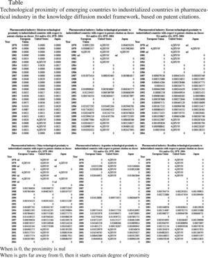 The countries considered to be emerging economies, receivers of technological flows are: China, India, Korea, Argentina, Brazil and Mexico. The industrialized countries, the source of technological knowledge, are the United States and Japan, as well as France, Germany and the United Kingdom, from the European Union. Among the emerging countries, there are important contrasts regarding economic growth and, particularly, the dynamism of the pharmaceutical sector. The selected industrialized countries are characterized as the main generators of new molecules and pharmaceutical processes.