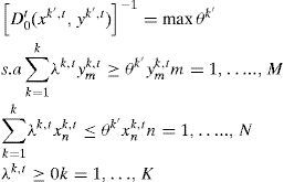 La estimación del índice Malmquist requiere del cálculo de las funciones de distancia correspondientes, para la cual existen varias maneras de abordarlo (Färe, Grosskopf y Roos, 1998). Una manera de realizar este cálculo es a través de programación matemática DEA, donde la función de distancia de un puerto k¿ en el periodo t y t+1, requiere resolver 4 problemas de programación lineal: D0tyt,xt,D0t+1yt,xt,D0tyt+1,xt+1 y D0t+1yt+1,xt+1. Para ello, se toma en cuenta que la función de distancia del output es recíproca a la medida de eficiencia técnica de Farrell orientada al ouput:
