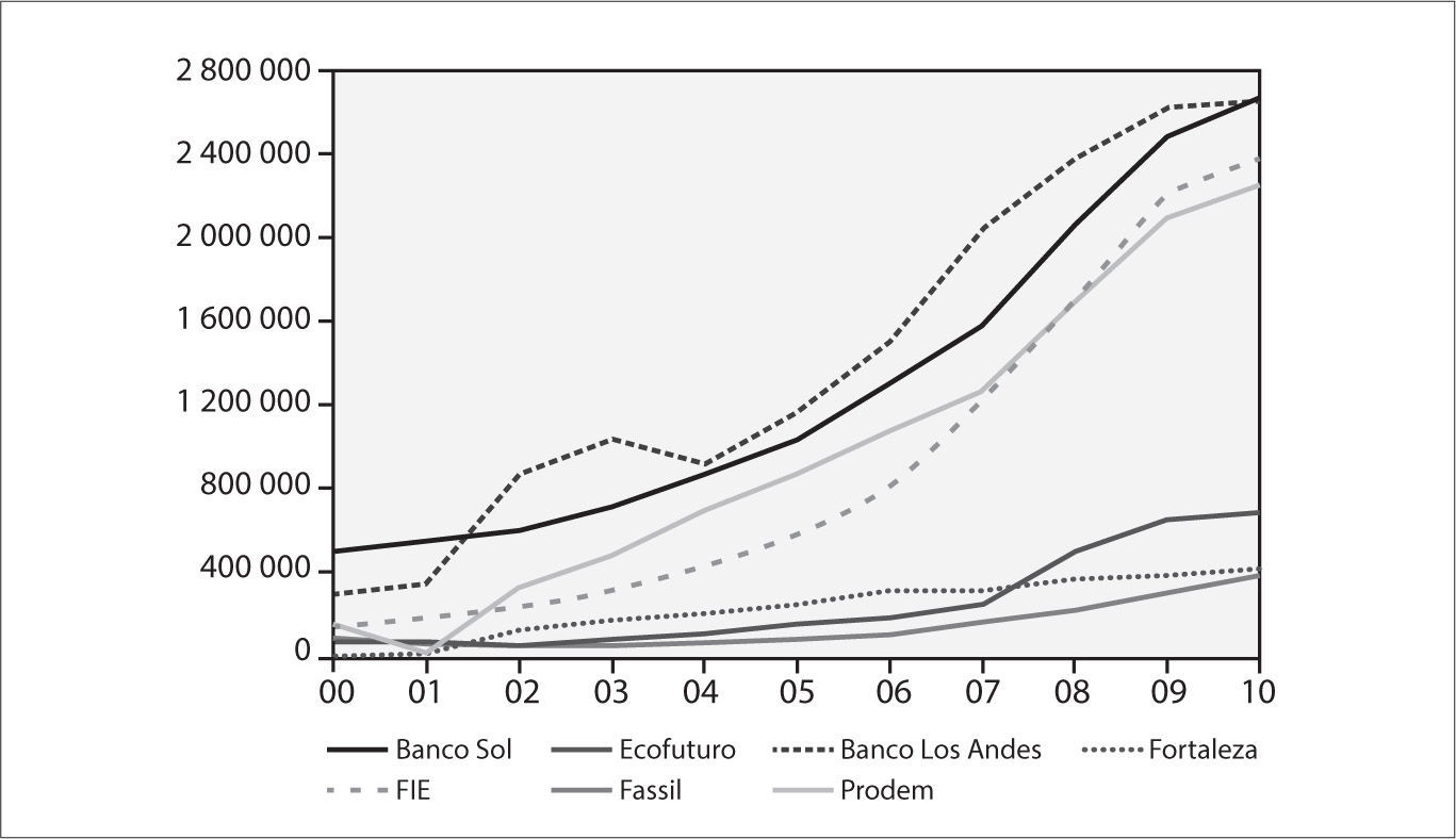 A continuación se muestra de manera detallada la evolución gráfica de la cartera total de siete instituciones microfinancieras pertenecientes a la asfi-Bolivia a lo largo del periodo 2000-2010.
