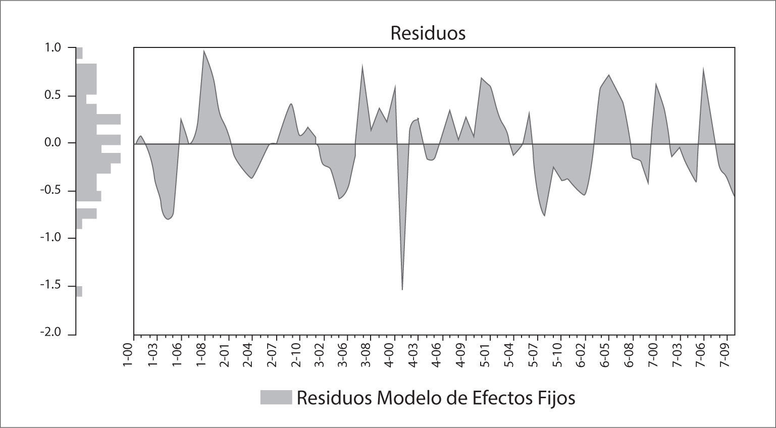 En la gráfica de los residuos del modelo de efectos fijos, se puede advertir de que existe un proceso de reversión a su media y que no tiene patrones sistemáticos (tendencia positiva o negativa), por lo tanto, desde el punto de vista gráfico, se afirma que los residuos son estacionarios o dicho de otra forma que existe cointegración en las variables en estudio.9
