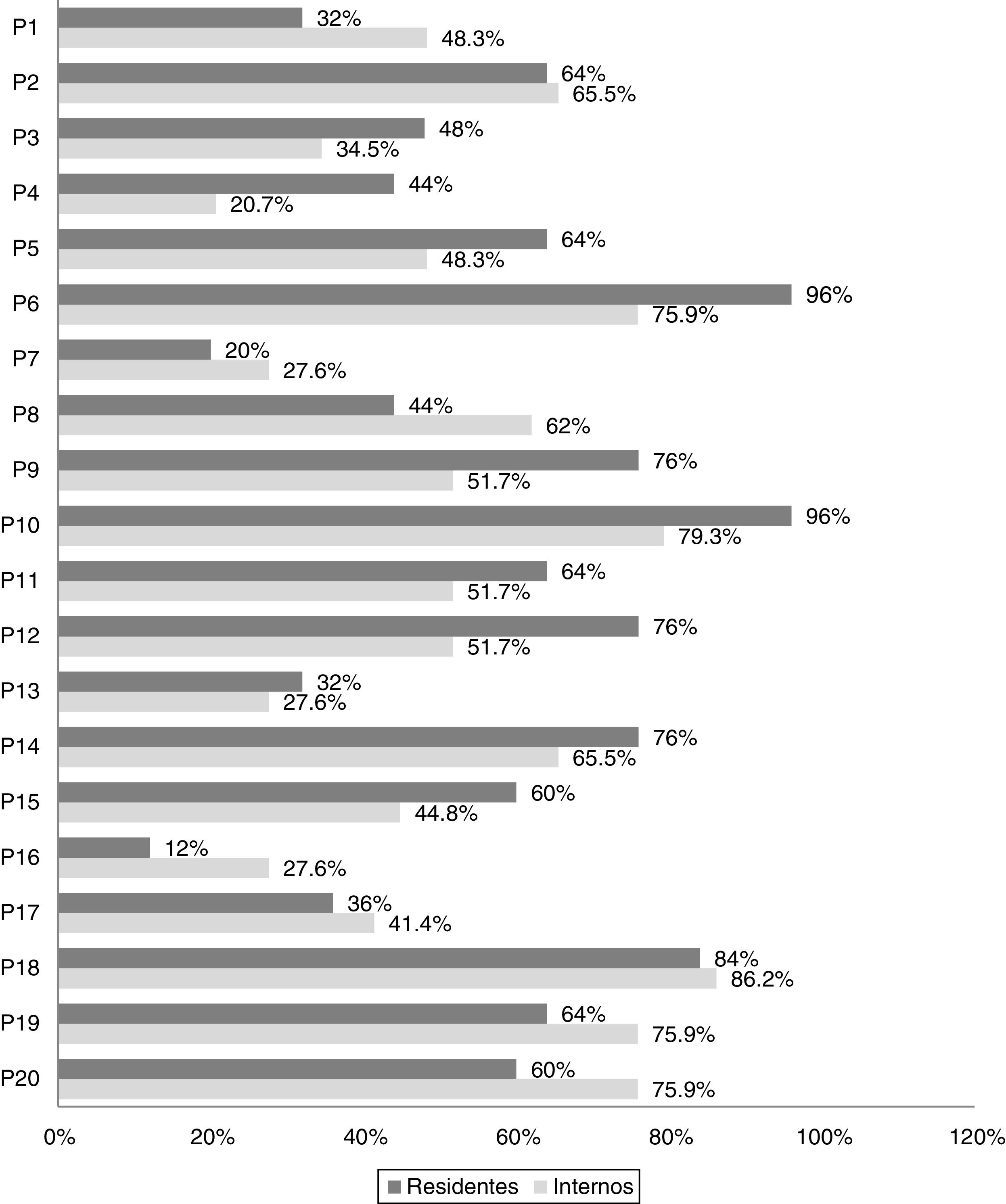 Las especialidades participantes en este estudio fueron: ginecología y obstetricia, anestesiología, medicina interna, pediatría, cirugía y medicina familiar. Todos los residentes se encontraban en su primer año de la especialidad.