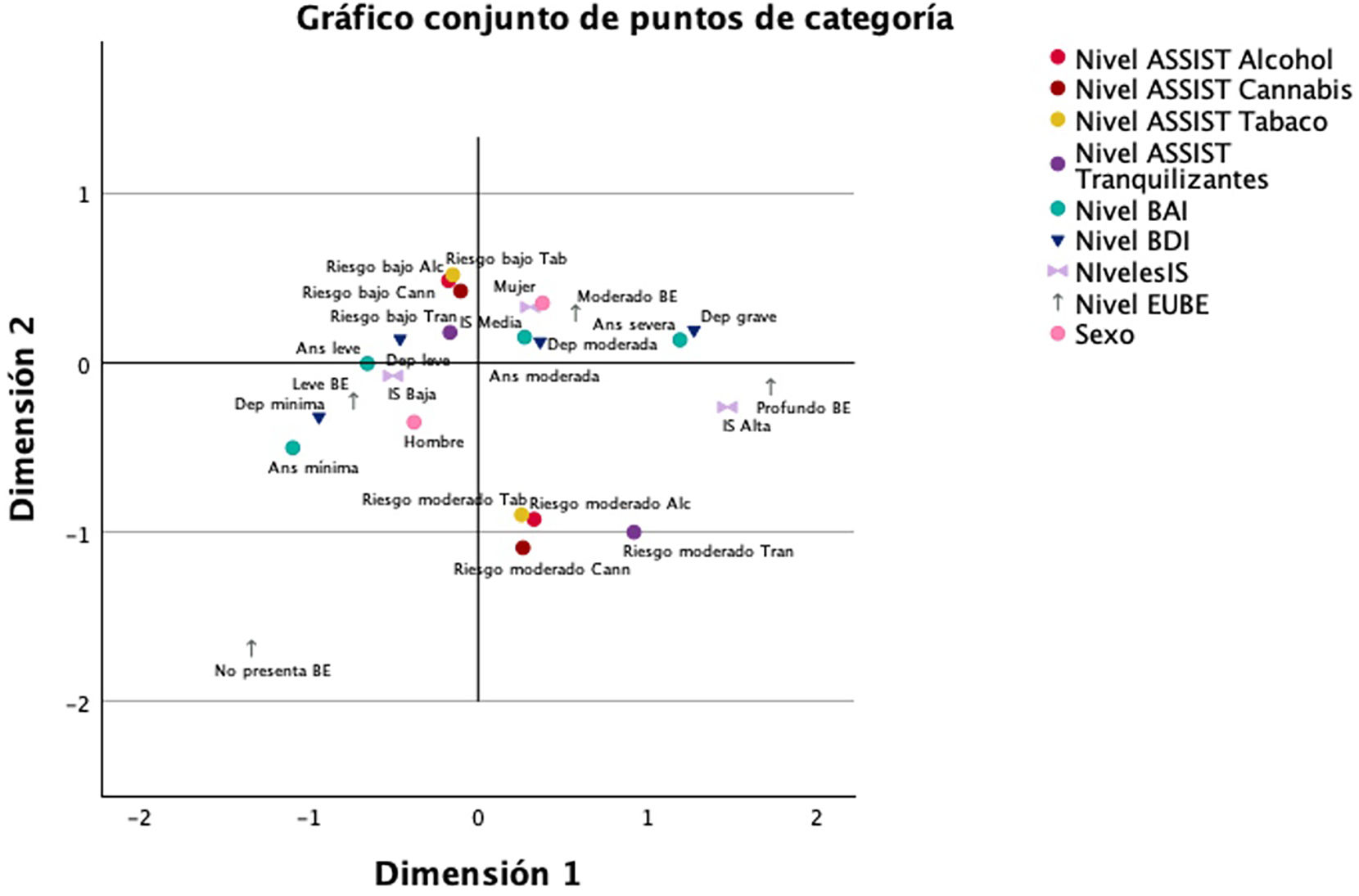 Posteriormente, se realizó un análisis de correspondencias múltiples (ACM) bidimensional con las variables no métricas de mayor prevalencia: niveles de burnout, ansiedad, depresión, ideación suicida, consumo de alcohol, tabaco, cannabis y tranquilizantes, así como el sexo. Se reportaron el porcentaje de variancia explicada por cada dimensión y la medida de discriminación de las variables definitorias.