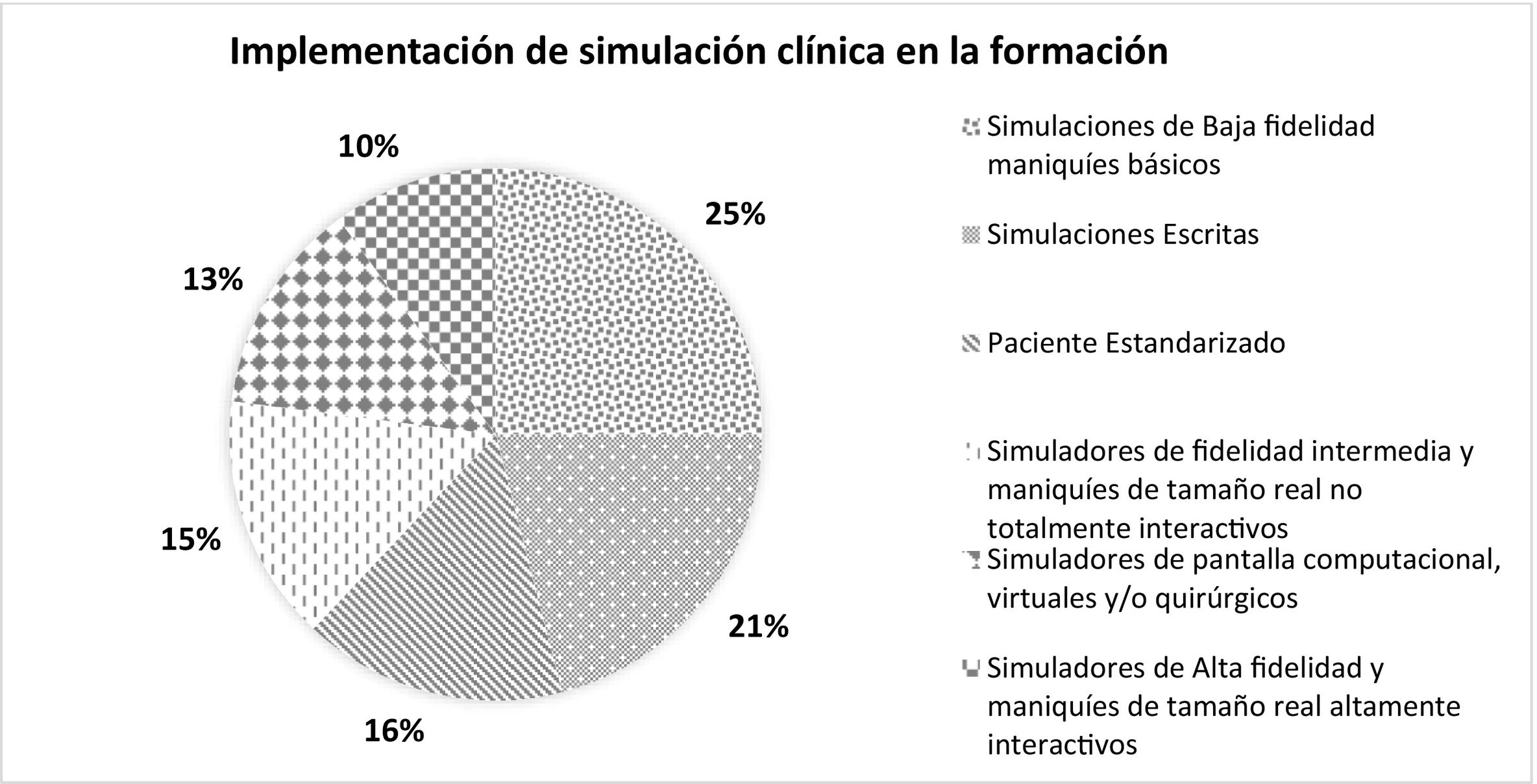 En la figura 1 se muestra que estudiantes, egresados, docentes y directivos coinciden en considerar la simulación clínica como una metodología fundamental para el aprendizaje desde los primeros semestres en todas las áreas del campo de la salud. En cuanto a los recursos utilizados, se observa una preferencia por los simuladores de baja fidelidad (25%) y el uso de pacientes estandarizados (21%), seguidos por simuladores de fidelidad intermedia (16%), simuladores computacionales (15%) y, en menor proporción, simuladores de alta fidelidad (10%).