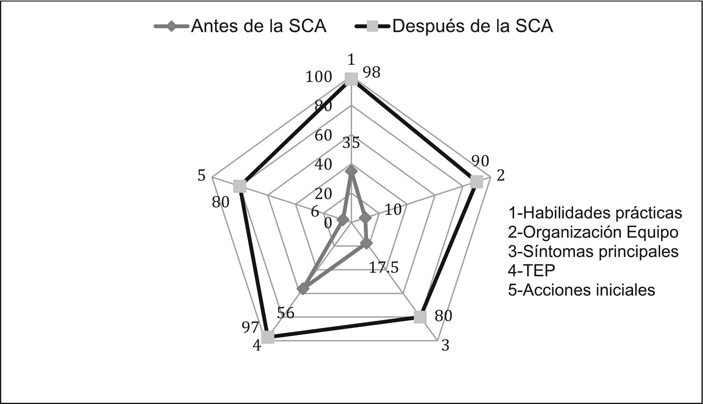 Los resultados se expresaron como media y desviación estándar, además de un histograma. Las variables de naturaleza cualitativa se describieron con frecuencias observadas y porcentajes. Se realizó una comparación de proporciones antes y después de la SCA, considerando estadísticamente significativa p<0,01 con un intervalo de confianza del 95%. Los datos fueron procesados en el programa estadístico SPSS.