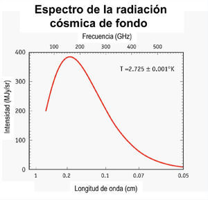 Cuando se calientan objetos metálicos, por ejemplo un alfiler en la estufa o una herradura en la fragua, inicialmente éstos se ponen “al rojo vivo”. Si se siguen calentando su color va cambiando del rojo hacia un azul muy tenue y brillante para finalmente verse blancos. Este cambio del color se debe a que, al aumentar la temperatura, a la radiación roja se agregan progresivamente otros fotones de mayor energía hasta cubrir todas las longitudes de onda del espectro visible, por eso los objetos se ven blancos. La radiación que absorbe y emite un cuerpo caliente en equilibrio a diferentes temperaturas se conoce como radiación del cuerpo negro y fue explicada por Max Planck en 1900, quien postuló la cuantización de la energía para explicar la distribución de frecuencias emitidas por un cuerpo negro a diferentes temperaturas. De manera similar, se piensa que cuando la temperatura en el Universo era aún muy alta, las partículas elementales se encontraban en un estado especial denominado plasma donde los electrones y los fotones interactuaban fuertemente en una especie de equilibrio (nasa. Universe 101, 2011). Pero aproximadamente 380,000 años después de la Gran Explosión la temperatura descendió a 3000 K. Entonces los electrones pudieron asociarse con los núcleos y formar los primeros átomos estables. Éstos ya no interactuaban tan fuertemente con los fotones de la radiación y se desacoplaron de ella pues ya no todos los fotones eran emitidos y absorbidos por los electrones sino que algunos ya pudieron viajar libremente sin ser absorbidos por éstos. Entonces el Universo dejó de ser opaco y la materia y la radiación siguieron enfriándose por separado. De acuerdo con lo que se sabe de la radiación del cuerpo negro, la radiación correspondiente estaba en la zona de los rayos ultravioleta pero la expansión constante del Universo provocó que las longitudes de onda de esta radiación también se hicieran más grandes. Por eso cuando en 1965 Penzias y Wilson dirigieron su antena de radiofrecuencia hacia diferentes direcciones del lejano espacio exterior detectaron radiación de muy baja energía en la zona del espectro de las microondas. Su distribución espacial era muy uniforme. Al hacer sus cálculos concluyeron que esa radiación correspondía a una temperatura de apenas 2.73 K. Su espectro se comporta casi exactamente como el de un cuerpo negro a esa temperatura. Esta radiación se ha interpretado como el eco que quedó de aquella gran explosión inicial que dio origen al Universo y es una de las principales evidencias experimentales que apoyan la teoría de la Gran Explosión. Ver gráfica.