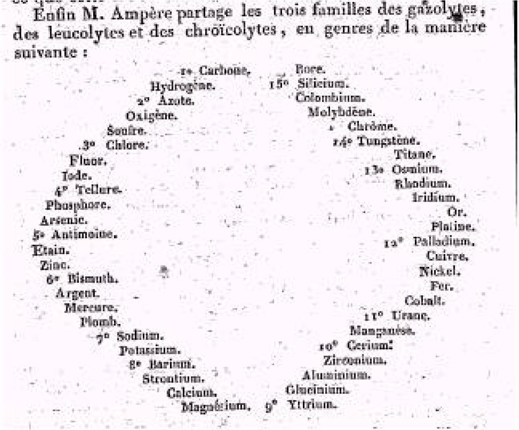 Sin embargo, Marie André Ampère en 1816 había publicado una memoria en los Annales de chimie donde criticaba la sobreestimación del oxígeno en las clasificaciones químicas. Él sugirió que los químicos siguieran el ejemplo que los naturalistas designarían como una “clasificación natural”, i. e. “una clasificación que siguiera todos los caracteres de las sustancias a ser clasificadas”, opuesta a las “clasificaciones artificiales” basadas en un único carácter (ver la ilustración 3 y la tabla 2).