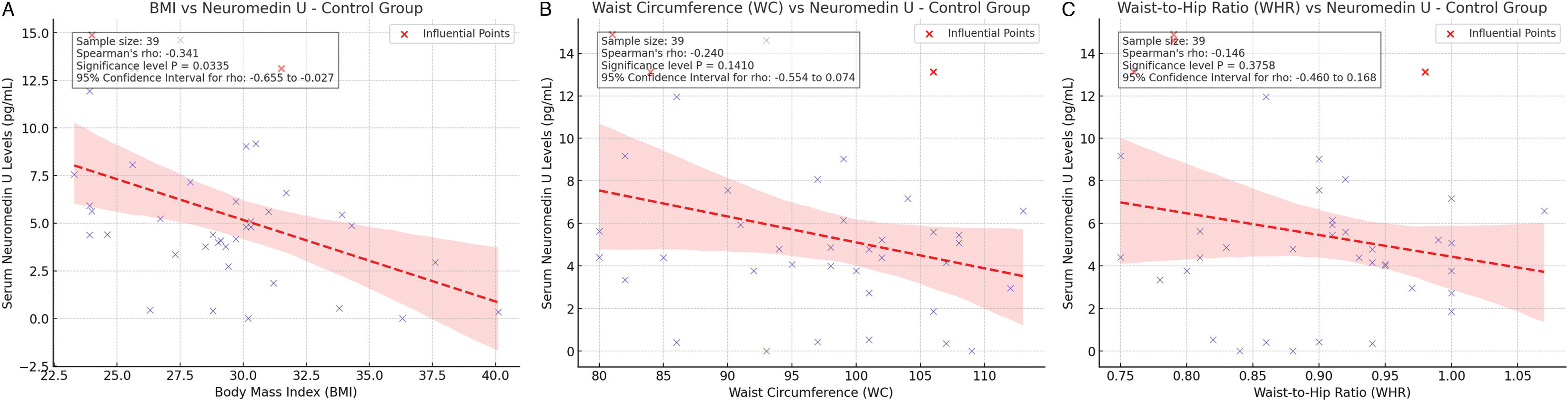 ConclusionesEl NMU puede no ser un biomarcador directo de diabetes, pero su correlación significativa con el IMC en individuos sanos sugiere un papel potencial en la regulación metabólica. Este es el primer estudio en el que se comparan los niveles de NMU entre subtipos diabéticos, lo que ofrece nuevas perspectivas sobre el papel del NMU en la homeostasis metabólica.