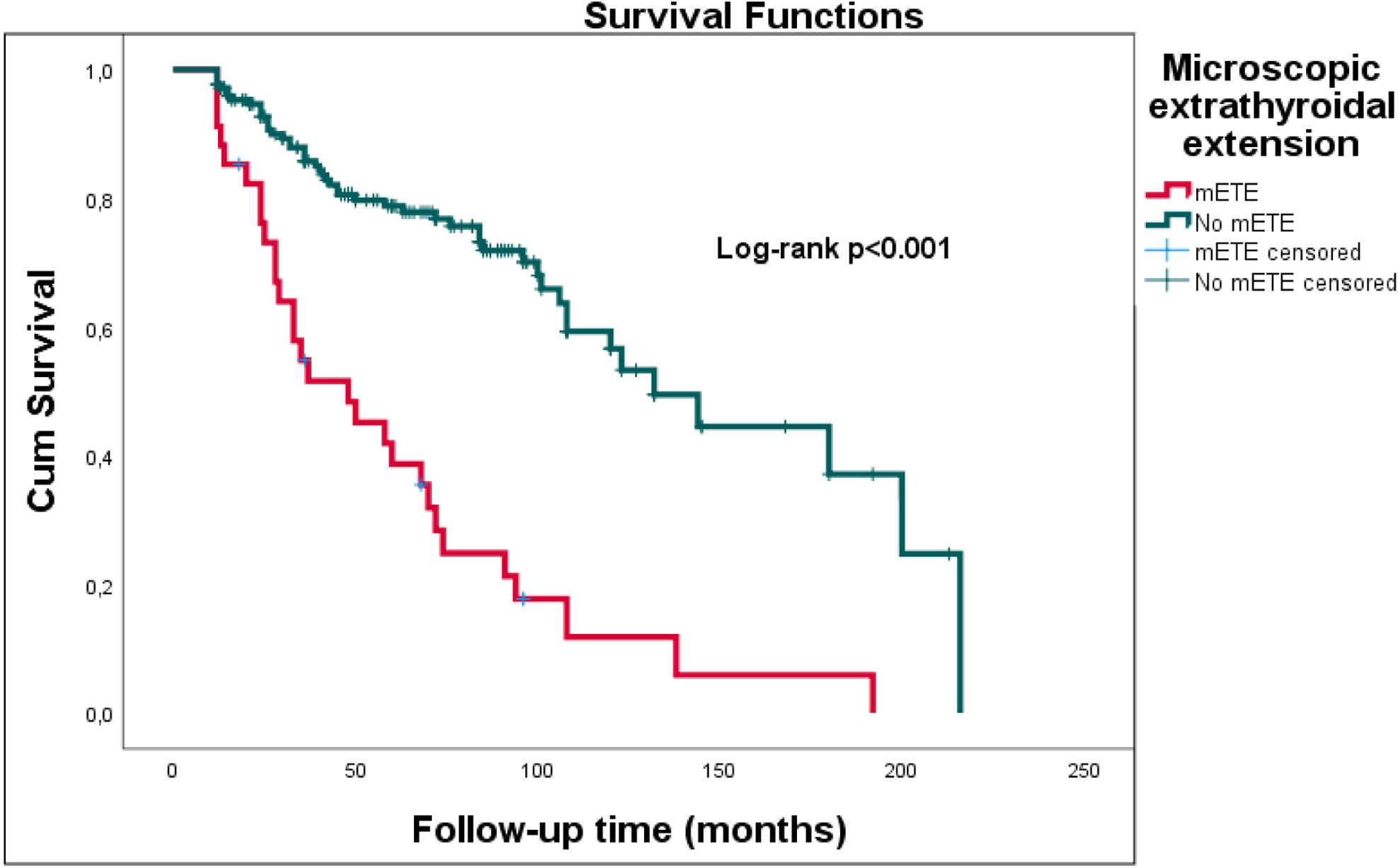 Despite several factors are associated with worse disease-free survival (DFS) and prognosis in medullary thyroid carcinoma (MTC) patients, the effect of microscopic extrathyroidal extension (mETE) on the prognosis and DFS is not well understood. This study aims to evaluate the impact of mETE on DFS and prognosis in patients with MTC.