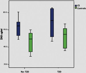 ResultsPlasma ZAG levels were significantly higher in patients with CS compared to controls (64.3±16.6 vs. 44.0±16.1, p=0.002). In a univariate analysis, ZAG levels positively correlated to 24-h urinary free cortisol (p=0.001), body mass index (p=0.02), non-esterified fatty acids (p=0.05), glucose (p=0.003), LDL-C (p=0.028), and type 2 diabetes mellitus (p=0.016), and were inversely related to total adiponectin levels (p=0.035). In a multivariate analysis, after adjusting for CS, ZAG levels only correlated with body mass index (p=0.012), type 2 diabetes mellitus (p=0.004), and glucose (p<0.001).