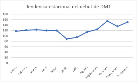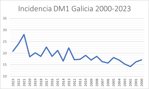 Conclusiones: Galicia presenta una incidencia alta de DM1 con un incremento significativo en los últimos años en consonancia a otros estudios publicados, con un pico de incidencia en periodo de pandemia y posterior normalización. En este estudio se observó mayor incidencia en otoño e invierno lo cual coincide con la mayoría de los datos publicados, pero esta diferencia es independiente del grupo de edad y demás variables analizadas. El grado de CAD al diagnóstico es similar a otros estudios españoles y europeos con predominio de cetoacidosis leve en los últimos años.