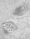 El examen microscópico mostró, en ambas biopsias, la presencia de parénquima mamario con importante fibrosis estromal, densa y de aspecto cicatricial (fibrosis queloidea), atrofia glandular con ectasia focal y un infiltrado inflamatorio linfocitario, con tendencia a formar pequeños cúmulos, con disposición preferentemente periductal y perilobulillar, aunque focalmente también perivascular (figs. 1 y 2). Se apreciaron escasos fibroblastos de morfología epitelioide. En secciones seriadas no se identificó lesión tumoral.