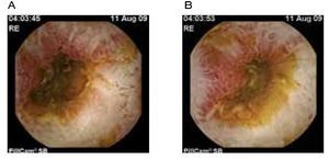 Figura 1. A) Úlcera en íleon y B) paciente con tumor submucoso ulcerado.