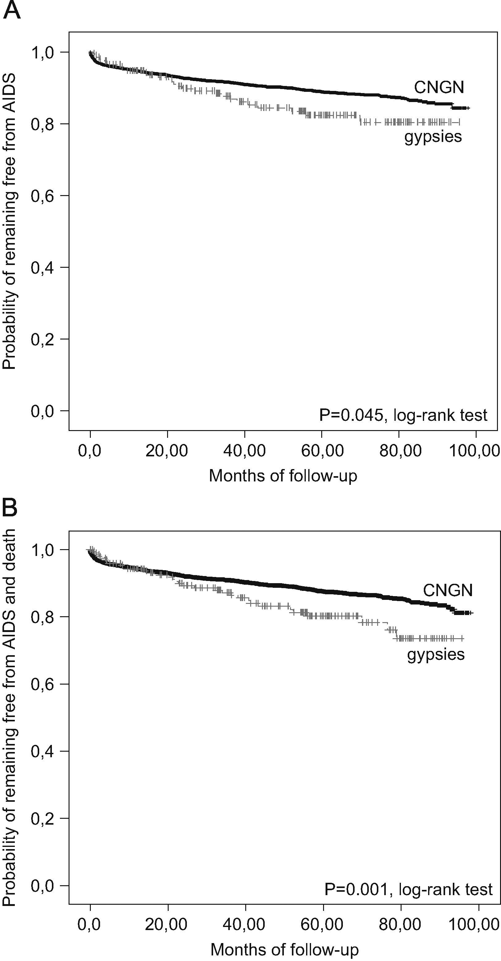 Median follow-up (and interquartile range) was 1533 days (694–2124) for gypsies and 1505 days (680–2221) for CNGN (P=0.59, U test). Although the percentage of patients who developed a new AIDS-defining complication did not differ between the study groups, the time to the event was significantly shorter for gypsies. Incidence rates for gypsies and CNGN, respectively, were 3.9 and 2.6 cases per 100 patient-years (C% PY); relative risk (RR): 1.49; 95% CI: 1.02–2.16; P=0.0447, Fig. 2A). The percentage of deaths and time to death was similar between gypsies and CNGN (IR, respectively, 0.84 and 0.53 C% PY; RR: 1.59; 95% CI: 0.62–3.79; P=0.255), but the time to HIV disease progression showed a significant difference favoring CNGN (IR for gypsies and CNGN: 4.6 and 2.95 C% PY; RR: 1.56; 95% CI: 1.07–2.26; P=0.017, Fig. 2B). A trend was found for CNGN to ever initiate antiretroviral treatment (ART) more frequently than gypsies do (85% versus 77%; OR: 1.40; 95% CI: 0.99–1.97; P=0.058). A non-significant higher percentage had done so before inclusion in the cohort (24% versus 19%; OR: 1.19; 95% CI: 0.72–1.83; P=0.33) and the same was true for the prospective follow-up (77% versus 72%; OR: 1.21; 95% CI: 0.92–1.88; P=0.14).