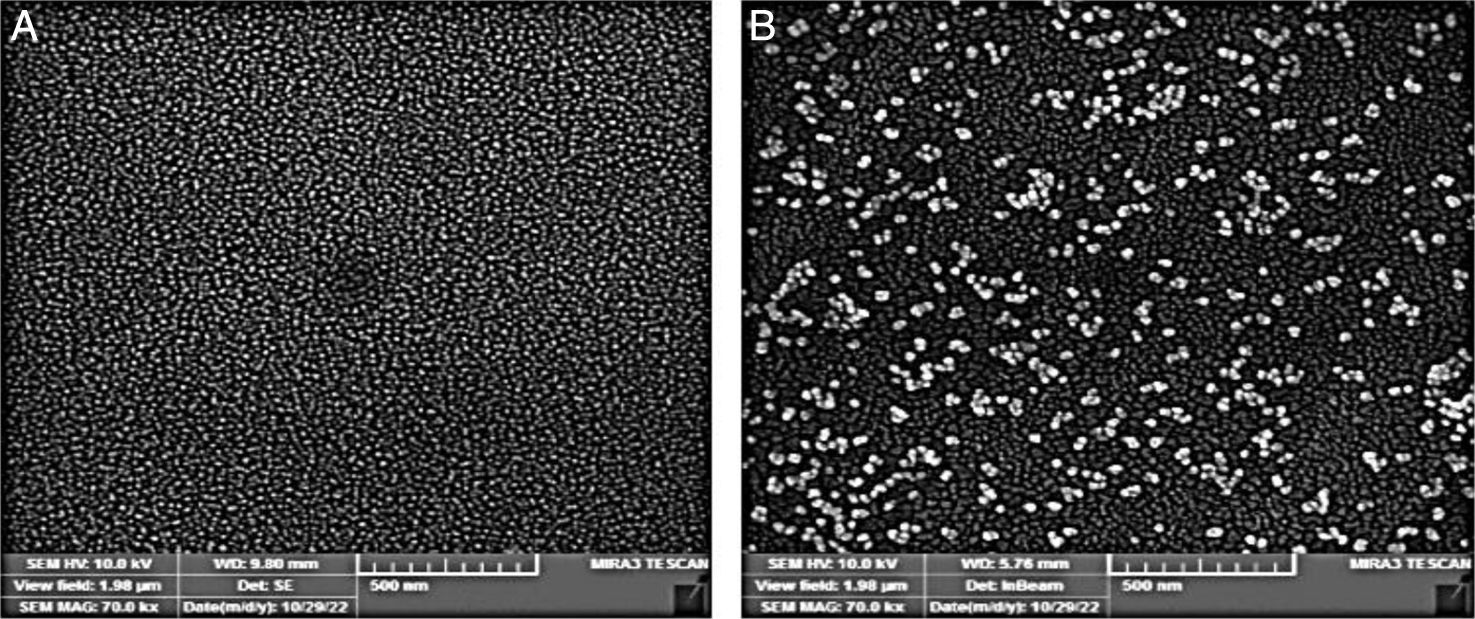 Preparation of spherical GNPs and coating GNPs with recombinant proteinsFor GNP production, we followed the Turkevich method. In a 50ml beaker, 750μl of 38.8mM trisodium citrate solution were rapidly added to 15ml of 1mM boiling HAuCl4. This was done with continued stirring. With the addition of trisodium citrate, the solution began to change color from bright yellow to black and then to red or purple. It was noted that the time of color change also varied with the amount of trisodium citrate. First, 400μg (786μl) of combination proteins (CFP-10, ESAT-6, TB7.7, TB10.4) were added to 300μl of the prepared GNP solution. The mixed solutions were stirred at room temperature (25°C), and incubated for 24h to generate coated GNPs with proteins. GNPs were collected by centrifugation (10,000rpm, 5min). The pellets were resuspended in a phosphate buffer (10mM). The characteristics of gold nanoparticles coated with antigens were investigated by dynamic light scattering (DLS) (GNPs without coating antigens; size (nm): 47nm, Zeta potential (mV): −21.6, PDI: 0.43; GNPs with coating antigens: size (nm): 78nm, Zeta potential (mV): −27.6, PDI: 0.35) and SEM (Fig. 1). The amount of proteins coated with GNPs was measured using the bicinchoninic acid method. After characterization, GNP solutions were filtered using a 0.22-μm syringe filter and stored at 4°C.