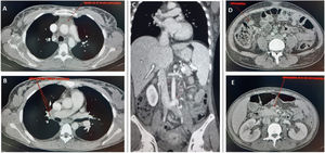 Evolucionó de forma desfavorable en planta, tanto clínica como analíticamente (Appendix B) por lo que se inició piperacilina-tazobactam y doxiciclina. Al 4.° día de ingreso presentó shock (PA: 70/40mmHg; FC:136 lpm) y oligoanuria, que no respondía a fluidoterapia por lo que se realizó nueva TC toracoabdominopélvica (Appendix B) que mostró múltiples adenopatías, sobre todo en raíz de mesenterio y FID, leve esplenomegalia, líquido en el receso pericárdico, edema periportal y ascitis leve-moderada. Ingresó en UCI con tratamiento con piperacilina-tazobactam, linezolid, ganciclovir y anfotericina B liposomal, a la espera de resultados microbiológicos. Ante la sospecha de shock séptico de origen abdominal-ginecológico, se realizó una laparotomía exploradora, que resultó sin hallazgos patológicos, salvo adenopatías mesointestinales y en mesocolon, que se resecaron.