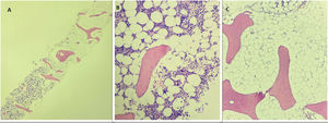 La biopsia fue informada como linfadenitis necrosante e hiperplasia linfoide reactiva con histiocitosis sinusoidal extensa, sin que se observaran fenómenos de hemofagocitosis (fig. 1). La PCR para SARS-CoV-2 en ganglio (GeneXpert®, Cepheid) fue positiva. Se inició dexametasona (20mg/día), con mejoría clínica; se retiró la noradrenalina y fue enviada a planta. Allí persistieron los vómitos y citopenias y requirió la transfusión de 2 concentrados de hematíes por anemia. Una biopsia de médula ósea (Appendix B) mostró hipocelularidad moderada, con patrón en mosaico. El ecocardiograma mostró derrame pericárdico leve y función sistólica y coronarias normales. Por último, se diagnosticó de SIM-A, puesto que cumplía los criterios de caso definitivo3. Se añadió inmunoglobulina intravenosa (IGIV) (2g/kg), con mejoría clínica y analítica. Fue dada de alta con corticoides en descenso, ácido acetilsalicílico (100mg/día) y enoxaparina profiláctica. Seis semanas después estaba asintomática y el ecocardiograma era normal, por lo que se retiró el ácido acetilsalicílico.