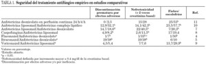En esta situación se han realizando numerosos ensayos clínicos con el objetivo de definir el antifúngico de elección en el tratamiento del síndrome febril persistente en el paciente neutropénico. Sin embargo llama la atención que pese a la ausencia de evidencia anteriormente señalada, no se haya vuelto a realizar ningún estudio para conocer si el TAE es realmente eficaz. Los resultados de estos estudios en su mayoría han demostrado que los fármacos comparados (anfotericina deoxicolato, fluconazol, itraconazol, anfotericina de dispersión coloidal, anfotericina liposomal y caspofungina) son equivalentes (A-I) 4-8 y en sólo un estudio voriconazol resultó inferior a anfotericina liposomal (A-I) 9. En cuanto a seguridad, los ensayos clínicos realizados señalan que fluconazol, itraconazol y anfotericina liposomal son mejor tolerados y más seguros que anfotericina deoxicolato 4,5,7; anfotericina liposomal mejor tolerada que anfotericina complejo lipídico 10; y caspofungina y voriconazol mejor tolerados que anfotericina liposomal 8,9 (tabla 1). En todos estos estudios la anfotericina deoxicolato, se administró a dosis de 0,6-0,7 mg/kg/día en un intervalo de 4-6 h 4,5,7. Sin embargo se ha demostrado que la administración de anfotericina deoxicolato a dosis de 0,79 a 0,98 mg/kg/día en perfusión continua (24 h o, al menos a una velocidad de infusión < 0,08 mg/kg/día), reduce la frecuencia de efectos adversos relacionados con la infusión, la nefrotoxicidad y la mortalidad a los 3 meses, comparada con su administración en el tiempo de perfusión habitual (4 h), incluso en los receptores de TPH que reciben fármacos anticalcineurínicos (tabla 1) (A-I) 11,12. Con la anfotericina deoxicolato en perfusión continua se consiguen administrar dosis muy elevadas, dosis inicial 1 mg/kg/día con incremento escalonado hasta 2 mg/kg/día, y prolongadas, 16 días (7-72), con buena tolerancia renal (B-II) 13.