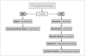 Si la fiebre tiene focalidad se iniciará el TAE con el antifúngico seleccionado según el síndrome clínico que presente el paciente, como se detalla a continuación y se expone en la tabla 5 y en la figura 1.