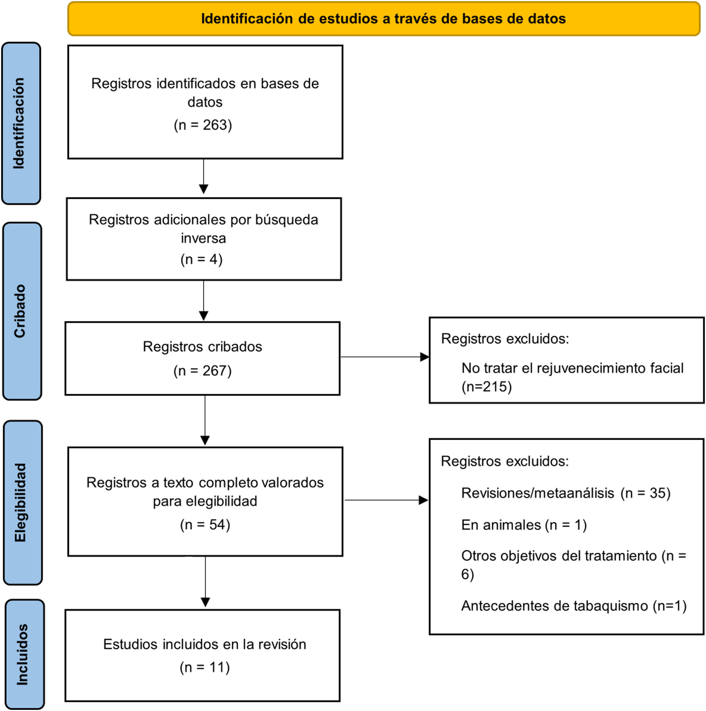 MetodologíaSe realizó una revisión sistemática de noviembre de 2022 a septiembre de 2024. Las búsquedas bibliográficas se realizaron en las bases de datos Pubmed, CINAHL, SCOPUS, Cuiden y Scielo, con los términos platelet rich plasma, rejuvenation, skin, plasma skin regeneration y platelet rich plasma rejuvenation. Se seleccionaron aquellos estudios publicados con participantes mayores de 18años y que utilizaran exclusivamente el PRP para el rejuvenecimiento facial, excluyendo trabajos con diseño de revisión y metaanálisis y cuyas muestras fueran pacientes con patologías que pudieran afectar al tratamiento.