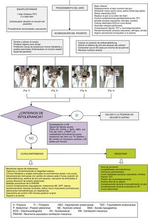 La responsabilidad de este cambio postural, al igual que la de todas las movilizaciones que se realizan a los pacientes, recae en el equipo enfermero que, para poder anticiparse y minimizar los riesgos, debe conocer las complicaciones relacionadas con este procedimiento, como son9,13: pérdida accidental y/o obstrucción del TET; pérdida accidental de accesos vasculares, drenajes y sondas; lesiones cutáneas; edema facial, palpebral y/o conjuntival; úlceras corneales; contracturas músculo-esqueléticas; lesión del plexo braquial; regurgitación y/o intolerancia a la nutrición enteral y alteraciones del estado hemodinámico y/o respiratorio.