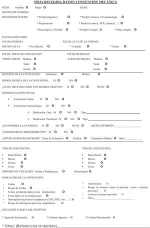 Variables estudiadasDemográficas (sexo, edad, diagnóstico médico, NEMS, fecha de ingreso y alta en la unidad, fecha de inicio y retirada de la CM); características de la CM (turno, duración, material utilizado, personal responsable de la orden, medidas alternativas, medida urgente, situación clínica del paciente, registro, información a la familia) y su indicación.