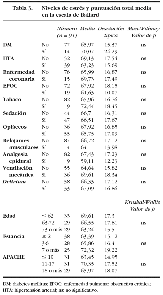 Inicialmente se realizó un estudio de frecuencias para cada uno de los ítems incluidos. Se estableció una variable dicotómica en la que se diferenciaba entre pacientes que consideraban o no estresante el ítem correspondiente, agrupando los valores 1 y 2 como no estresante y 3 y 4 como estresante. En cada ítem los valores se expresan como número (n.o) y porcentaje (%) de pacientes que lo consideraban bastante o muy estresante. Se calcularon, así mismo, las puntuaciones medias de las distintas preguntas de la escala de Ballard, y se ordenaron de mayor a menor rango en función de su puntuación media y del número y porcentaje de pacientes que respondieron que consideraban el ítem como estresante.