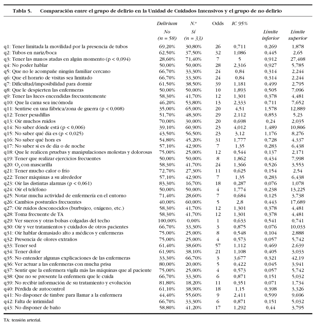 Los pacientes diagnosticados de delirio recordaron como situaciones estresantes: tener las manos atadas en algún momento (OR: 5; IC 95%: 1-27,5), sentirse en una fábrica o zona de guerra (OR: 4,5; IC 95%: 1,5-12,8), no saber dónde está (OR: 4; IC 95%: 1,5-10,8) y no saber qué día es (OR: 3,1; IC 95%: 1,1-8,2).