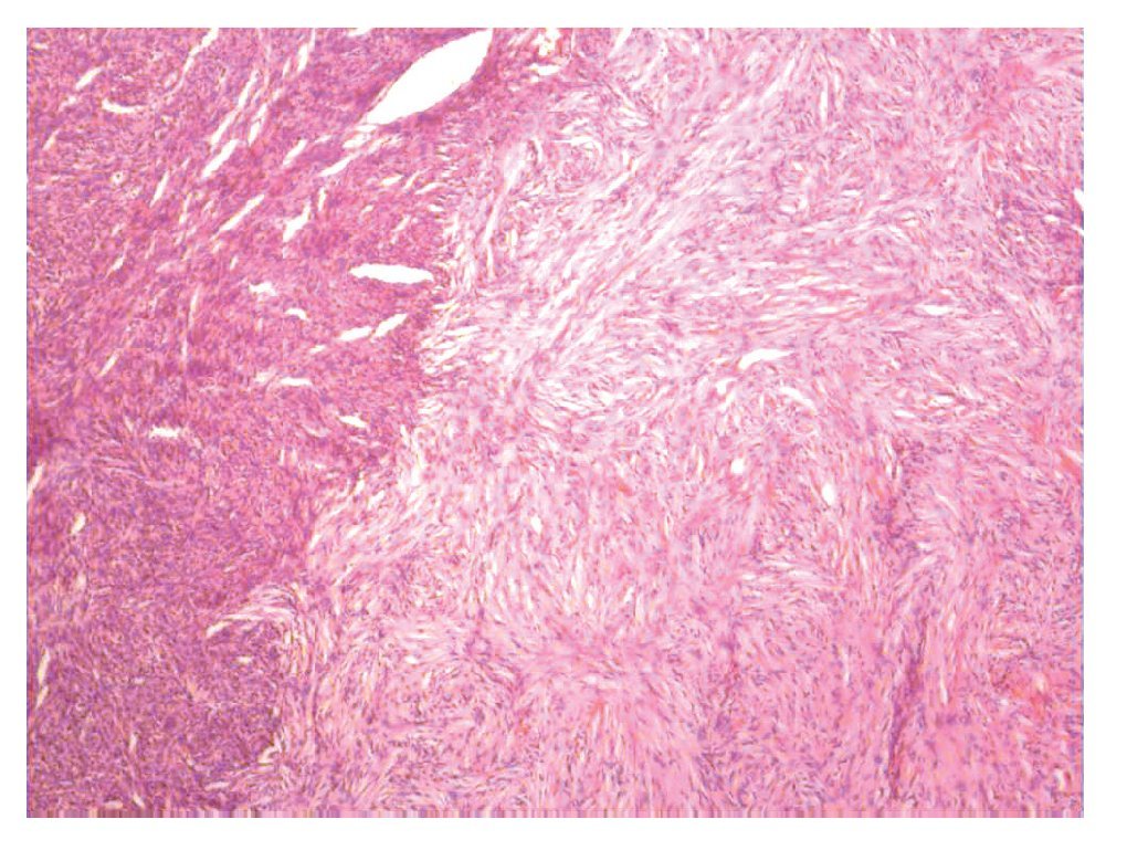 Figura 5.Corte histológico en donde se ilustra la transición abrupta entre Dermatofibrosarcoma Protuberans convencional y fibrosarcoma.