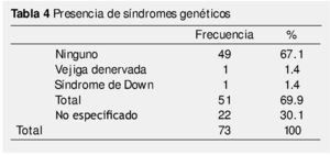 En cuanto a la asociación con síndromes genéticos o malformaciones agregadas, en el 67.1% de los casos la neoplasia no se presentó con asociación a algún síndrome, 30.1% no se especificaba, encontrándose un caso de vejiga denervada y otro asociado a síndrome de Down (tabla 4). El 82.2% no presentaron malformación congénita asociada; para el resto, el ureterocele bilateral fue el más común con un 2.8% (tabla 5).
