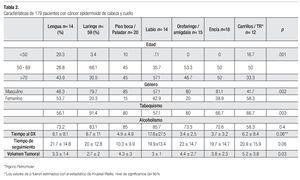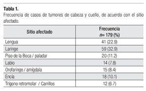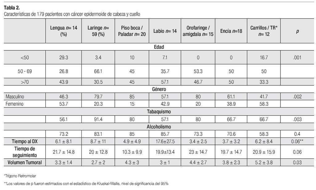 Se incluyeron 179 pacientes con CECyC con media de edad de 64.5 ± 12.7 años, sin diferencia entre hombres y mujeres (p = 0.3). La relación entre ambos géneros fue de 2:1 a favor de hombres (119:60). La distribución por sitios de origen del tumor se muestran en la Tablas 1 y 2, en 105 pacientes (58.6%) el tumor se originó en la cavidad oral, seguido por la laringe en 59 (32.9%). El tiempo promedio transcurrido entre el inicio de síntomas y el diagnóstico fue de 7.7 meses, con mediana de tres. El tiempo medio de seguimiento fue de 19 meses, con intervalo de uno a 48 meses. Fue más frecuente en hombres (p = 0.002) y menores de 50 años de edad (p ≤ 0.001), y en fumadores en forma estadísticamente significativa (p = 0.003).