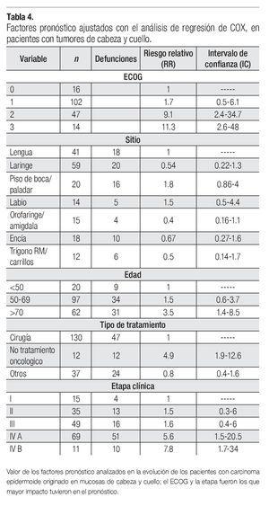 En nuestra serie se encontró que el ECOG fue un factor pronóstico determinante con significancia estadística. La pérdida de peso (asociada al estado general del paciente) tiene impacto en la supervivencia, estos hallazgos pueden estar relacionados con factores sociodemográficos de nuestra población (nivel económico y estado nutricional). Aunque no encontramos diferencia significativa en el pronóstico en pacientes VPH+, probablemente por el número de efectivos, un hallazgo interesante fue que aquellos que fueron VPH+ y recibieron radioterapia como parte del tratamiento tuvieron mejor control local y supervivencia aunque no en forma estadísticamente significativa, probablemente el incluir un mayor número de pacientes podría darle validez a este hallazgo.