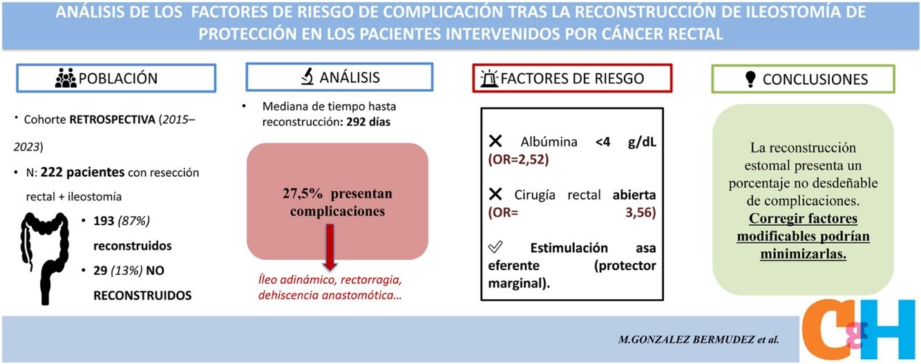 ConclusiónLa reconstrucción estomal presenta un porcentaje no desdeñable de complicaciones. Factores modificables como el abordaje laparoscópico de la enfermedad rectal y el correcto estado nutricional prequirúrgico podrían minimizarlas.