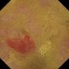 Se realiza gastroscopia donde únicamente se detecta una mucosa con eritema parcheado en el antro y cuerpo, sin otras lesiones asociadas. En la ileocolonoscopia se visualizan en sigma orificios diverticulares aislados, sin datos de sangrado. Se realiza, entonces, cápsula endoscópica, y se aprecia en yeyuno la existencia de una formación sobreelevada de aspecto polipoide y mucosa erosionada en el vértice de su superficie, de 1cm de tamaño (fig. 1). Dado que podría relacionarse con el cuadro clínico de la paciente, se decide llevar acabo la resección del segmento de intestino delgado descrito y se realiza anastomosis quirúrgica látero-lateral. El resultado histológico reveló un hemangioma polipoide (hemangioma capilar lobulillar) en la mucosa, ulcerado superficialmente y con signos de sangrado, sin signos de malignidad.