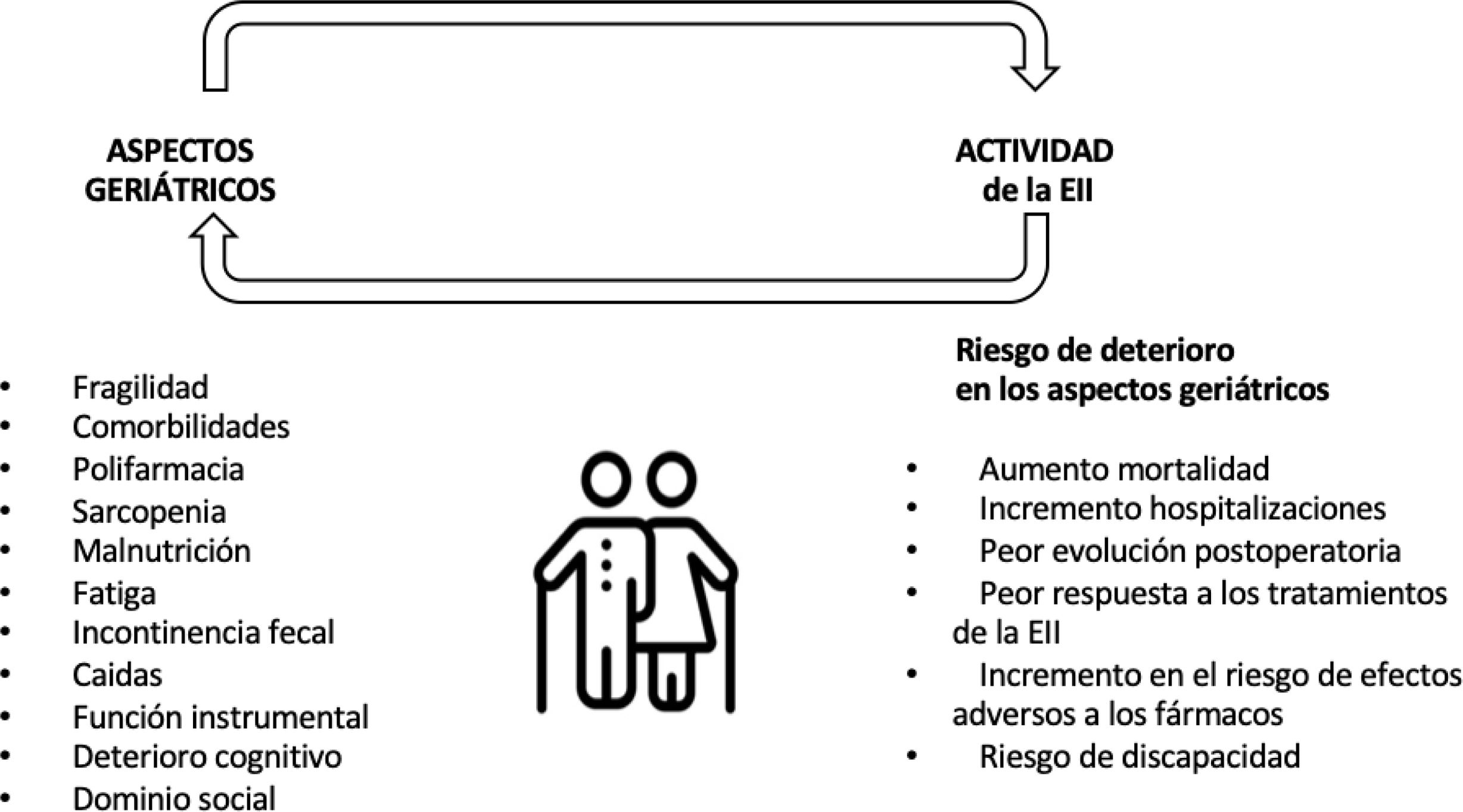 La fragilidad es un estado de vulnerabilidad caracterizado por una disminución de la reserva fisiológica y la capacidad de respuesta ante el estrés, lo que aumenta el riesgo de complicaciones, efectos adversos a los tratamientos y al deterioro funcional. La valoración de la fragilidad permite determinar la edad biológica de los pacientes, más allá de su edad cronológica, proporcionando una visión más precisa de su estado de salud y necesidades asistenciales. La proporción de adultos de edad avanzada con EII se halla en aumento de forma paralela al envejecimiento de la población general y se estima que, en la próxima década, más de un tercio de los pacientes con EII superarán los 60 años. Esta población puede sufrir las complicaciones derivadas de la propia EII desarrolladas previamente a la vez que es particularmente susceptible a desarrollar efectos secundarios del tratamiento, lo que hace imprescindible su evaluación integral con el fin de identificar aquellos más vulnerables. A la fragilidad se unen otros síndromes geriátricos como la comorbilidad y la polifarmacia que pueden interferir de forma notable con el manejo y el curso de la EII, condicionando la estrategia terapéutica y el pronóstico.