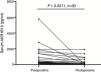 HCC patient's serum AKR1B10 level decreased significantly after hepatectomyTo validate whether serological AKR1B10 in HCC patients was changed after hepatectomy, we examined AKR1B10 in sera from the same patient at different time point including pre-operation and 3–4 days after hepatectomy. Results from 30 patients with HCC revealed that postoperative serological AKR1B10 was 266.85±452.69pg/ml, which was significantly lower than preoperative serological AKR1B10 (771.35±1175.05) (T=2.439, P=0.0211, Fig. 3). Therefore, these data suggested that hepatectomy could decrease serological AKR1B10.